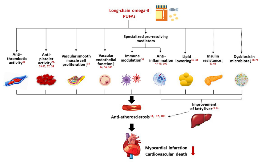 EPA와 DHA는 혈중 콜레스테롤 수치를 감소시키고 혈액 응고를 억제하여 심혈관 질환 위험을 줄일 수 있습니다.