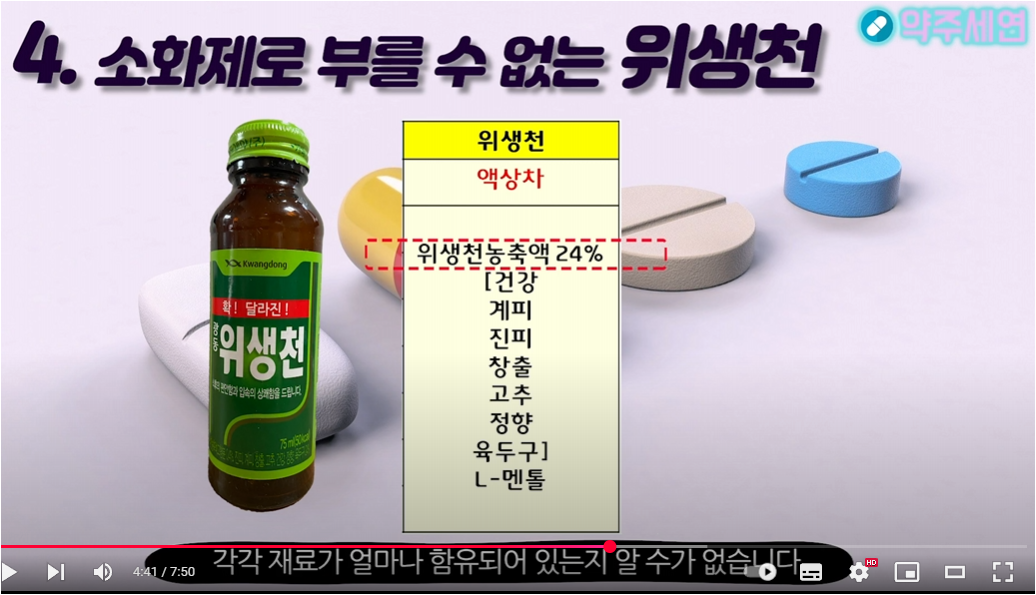 제가 이번 글을 쓰면서 다양한 약사님들의 유투브도 많이 참고했는데요, 편의점에서 쉽게 살 수 있고, 가장 가격도 저렴해서 많이 먹었던 위생천은 소화제라는 말을 쓸 수 조차 없는 액상차로 분류된다고 합니다.